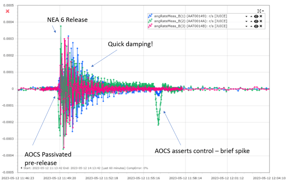 Este gráfico muestra el impacto mecánico producido por el disparo del actuador en el soporte de montaje. El actuador se disparó en el momento con la etiqueta ‘NEA 6 Release’. La oscilación de amortiguación resultante indica que la antena se suelta y luego se tambalea hacia adelante y hacia atrás antes de estabilizarse en una posición extendida y bloqueada. ESA, CC BY-SA 3.0