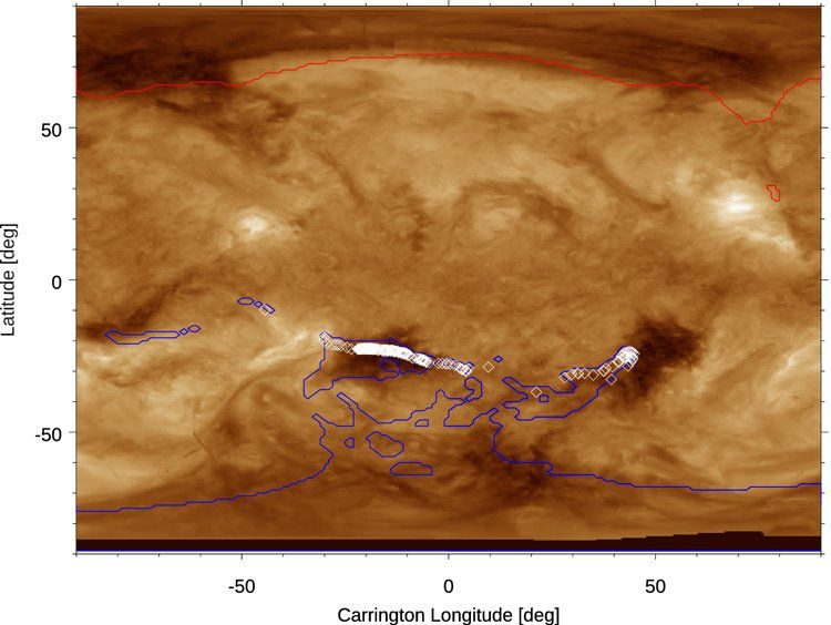 La imagen anterior marcada con líneas de colores que indican los límites de las líneas de campo abierto (apuntar hacia afuera es rojo, apuntar hacia adentro es azul) según lo predicho por un modelo de computadora. Estas regiones corresponden bien a los agujeros coronales en el mapa EUV. Las cajas blancas muestran los puntos de origen de las líneas de campo magnético por las que pasó la sonda solar Parker mientras viajaba a través de la superficie del sol.