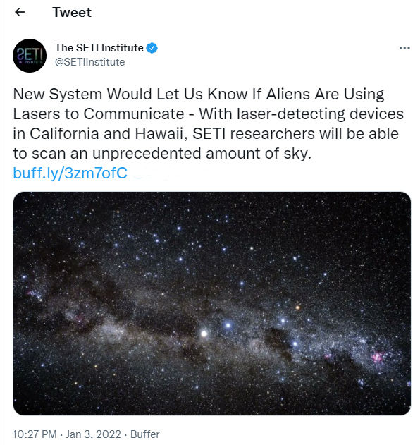 Tweet informativo del SETI. Crédito: Search Extra Terrestial Inteligence