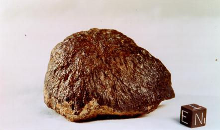 Una piedra de meteorito de Marte (shergottita) encontrada en la Tierra que pesa 245,4 gramos. Se muestra un cubo cuadrado de 1 cm a escala.